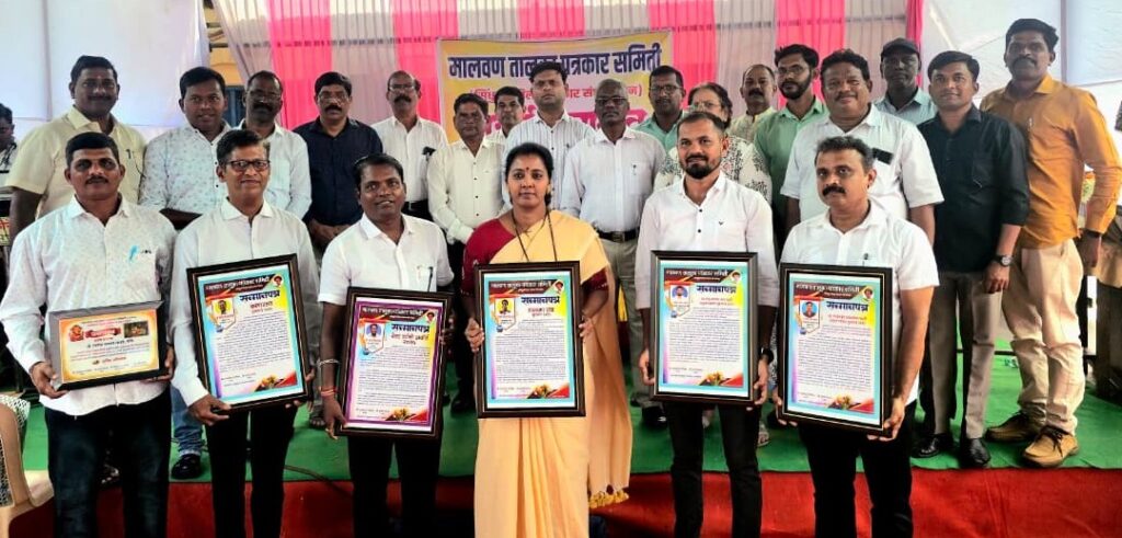 मालवण तालुका पत्रकार समितीचा वार्षिक पुरस्कार वितरण समारंभ मसूरे येथील आर. पी. बागवे हायस्कूलमध्ये उत्साहात संपन्न झाला. यावेळी समाजात उल्लेखनीय कार्य करणाऱ्या व्यक्तींना दिला जाणारा ‘मालवण रत्न पुरस्कार’ शिक्षिका व इतिहास अभ्यासक सौ. ज्योती रविकिरण तोरसकर यांना, तर ‘कलारत्न पुरस्कार’ श्री. निलेश गवंडी यांना मान्यवरांच्या हस्ते प्रदान करण्यात आला. पुरस्कारार्थींना शाल, श्रीफळ, सन्मानपत्र व सन्मानचिन्ह देऊन गौरविण्यात आले.