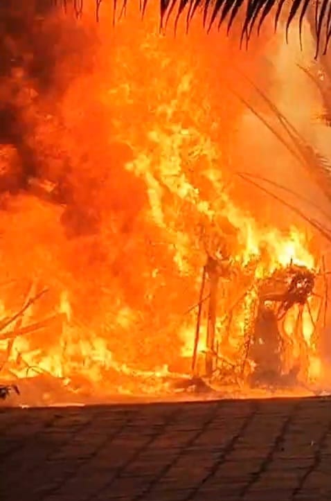 आज सोमवारी सायंकाळी ४ वाजण्याच्या सुमारास तेरेकर रापण संघाच्या मांगरीतून धूर येताना एका पर्यटकास दिसला. त्याने ही घटना अशोक महादेव शेलटकर या मच्छिमारास सांगितल्या नंतर क्षणाचाही विलंब न लावता अशोक शेलटकर यांनी आग विझविण्यासाठी पाण्याचा पंप सुरु करीत आपल्या सहकाऱ्यांना तसेच ग्रामस्थांना हाकाऱ्या मारल्या. मांगरीला आग लागल्याचे समजताच ग्रामस्थांनीही धाव घेत आग विझविण्याचा जोरकस प्रयत्न केला. मात्र, सोसाट्याच्या वाऱ्यामुळे आगीने भडका घेतला होता. आगीच्या उंचच उंच ज्वाळा आभाळाच्या दिशेने झेपवात होत्या. तर सर्वत्र धुराचे साम्राज्य पसरले होते. जिवाच्या आकांताने रापणकर मंडळींसह ग्रामस्थ आग विझविण्यासाठी आटोकाट प्रयत्न करत होते. मात्र त्यांचे हे प्रयत्न अपुरे पडत होते. सुमारे दोन अडीज तासात शर्थीचे प्रयत्न करूनही मांगरीला लागलेली आग विझविण्यात ग्रामस्थांना यश आले नाही.
